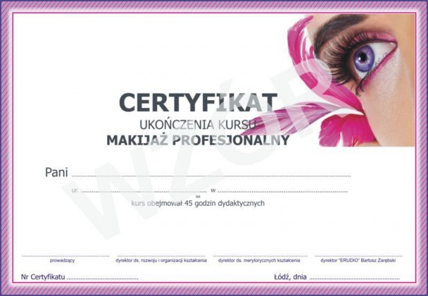 Na podstawie egzaminu wydawane jest Zaświadczenie ukończenia Kursu Makijażu profesjonalnego (dokumenty wydawane są na mocy Rozporządzenia Ministra Edukacji i Nauki z dnia 3 lutego 2006 r. w sprawie uzyskiwania i uzupełniania przez osoby dorosłe wiedzy ogólnej, umiejętności i kwalifikacji zawodowych w formach pozaszkolnych), uprawniające do samodzielnego wykonywania zabiegów z zakresu zagadnień objętych kursem.