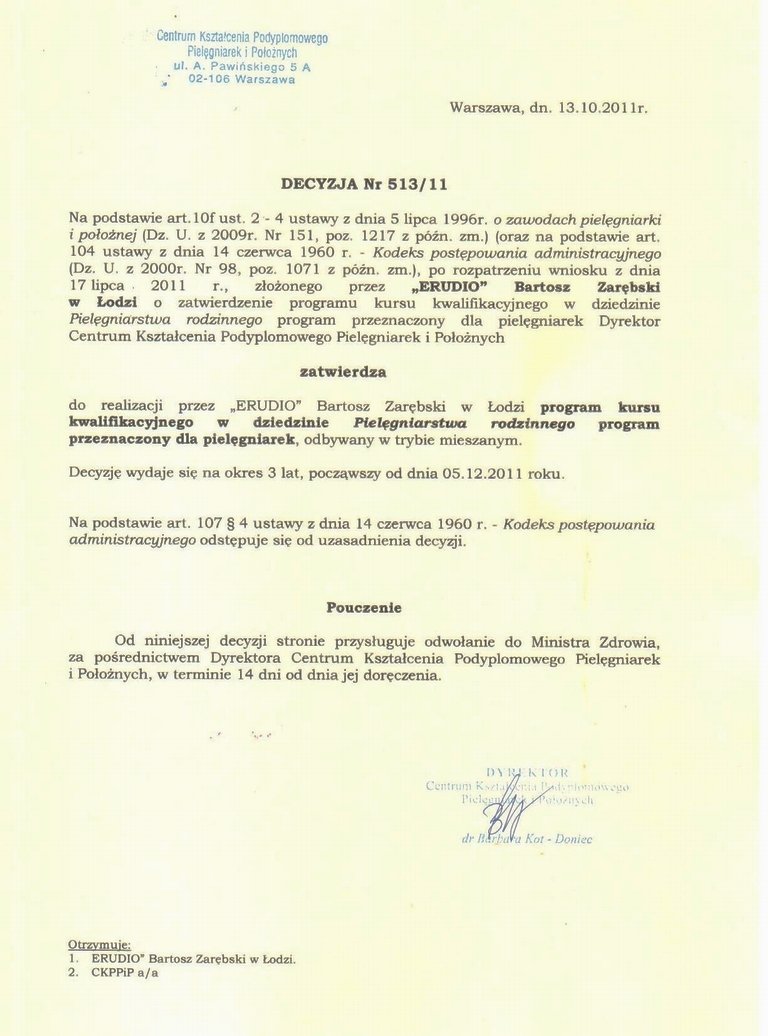 ERUDIO - Centrum Kształcenia Ustawicznego w Łodzi realizuje Kurs kwalifikacyjny w dziedzinie Pielęgniarstwa rodzinnego dla pielęgniarek na podstawie DECYZJI Nr 511/11 (kliknij w obrazek, aby powiększyć w nowym oknie):