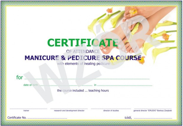Na podstawie egzaminu wydawane jest Zaświadczenie ukończenia Kursu Manicure, pedicure z zabiegami SPA (dokumenty wydawane są na mocy Rozporządzenia Ministra Edukacji i Nauki z dnia 3 lutego 2006 r. w sprawie uzyskiwania i uzupełniania przez osoby dorosłe wiedzy ogólnej, umiejętności i kwalifikacji zawodowych w formach pozaszkolnych), uprawniające do samodzielnego wykonywania zabiegów z zakresu zagadnień objętych kursem.