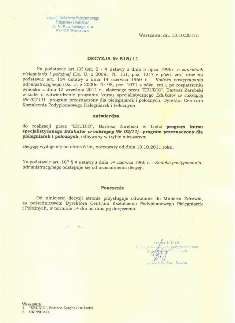 Podyplomowego Pielęgniarek i Położnych w Warszawie, po stwierdzeniu