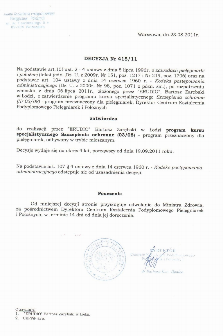 ERUDIO - Centrum Kształcenia Ustawicznego w Łodzi realizuje Kurs specjalistyczny w zakresie Szczepień ochronnych dla pielęgniarek na podstawie DECYZJI Nr 415/11 (kliknij w obrazek, aby powiększyć w nowym oknie):