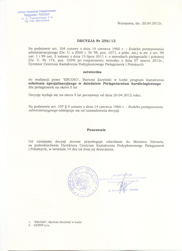 Centrum Edukacji ERUDIO w Łodzi realizuje Szkolenie specjalizacyjne w dziedzinie Pielęgniarstwa operacyjnego dla pielęgniarek na podstawie DECYZJI Nr 256/12 (kliknij w obrazek, aby powiększyć w nowym oknie):